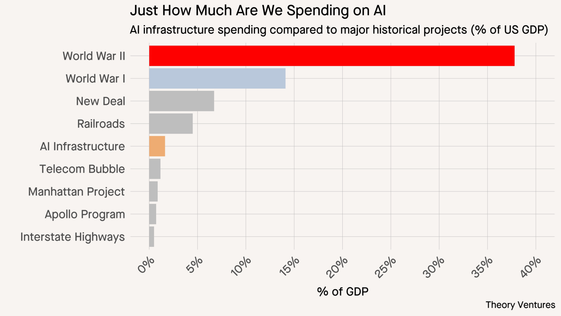 Keep seeing cool charts on where the AI infrastructure buildout compares to other buildouts in the US. The best comparison is probably the railroads as the new deal and the wars were more government than private funded.