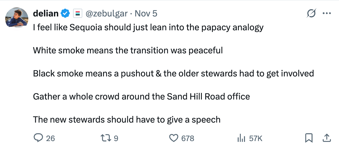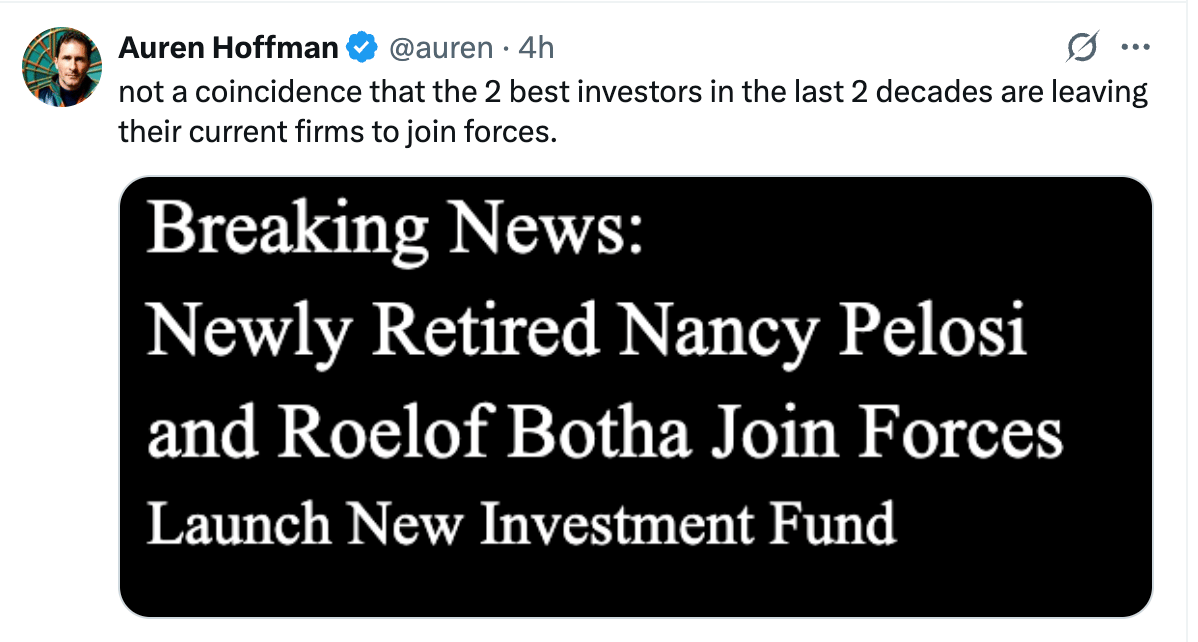 Sequoia is one of the most storied firms in Silicon Valley, so when there’s some scuttlebutt, it tends to go viral quickly. Roelof Botha, the lead partner, stepped down this week after just a couple of years in the role, and he’s only just over 50. Some reports suggest that a few other partners disagreed with the direction of the firm. The result is that Pat Grady and Alfred Lin are now in charge. All three are excellent investors. My only comment is about timing — Roelof was on two great podcasts recently (1, 2), and he didn’t sound like someone reminiscing on his career.